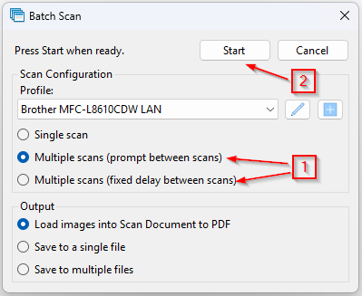 2, In the Batch Scan window, choose Multiple scans (prompt between scans) or Multiple scans (fixed delay between scans), then click the Start button.