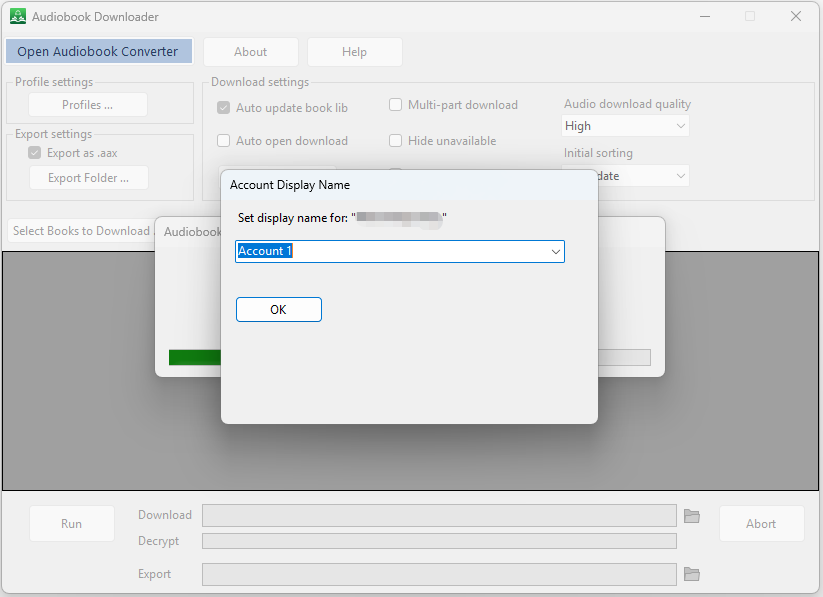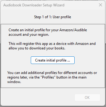 i) When you run Audiobook Downloader for the first time, the “Audiobook Downloader Setup Wizard” will pop up. Click the button “Create initial profile …”.