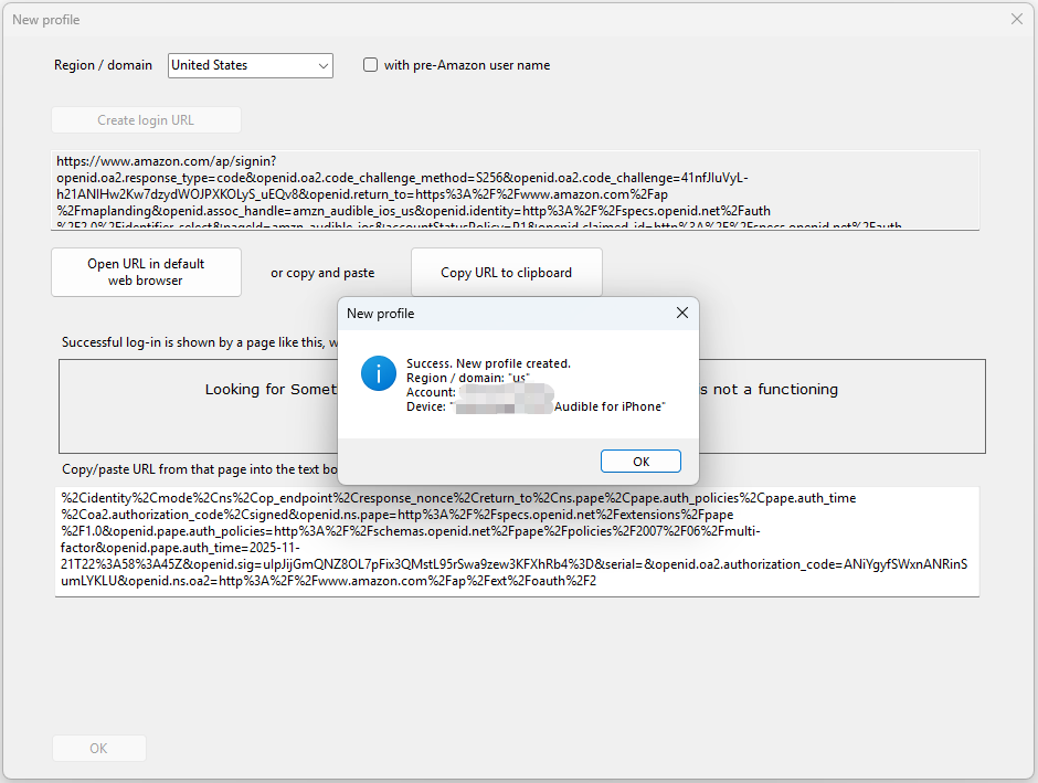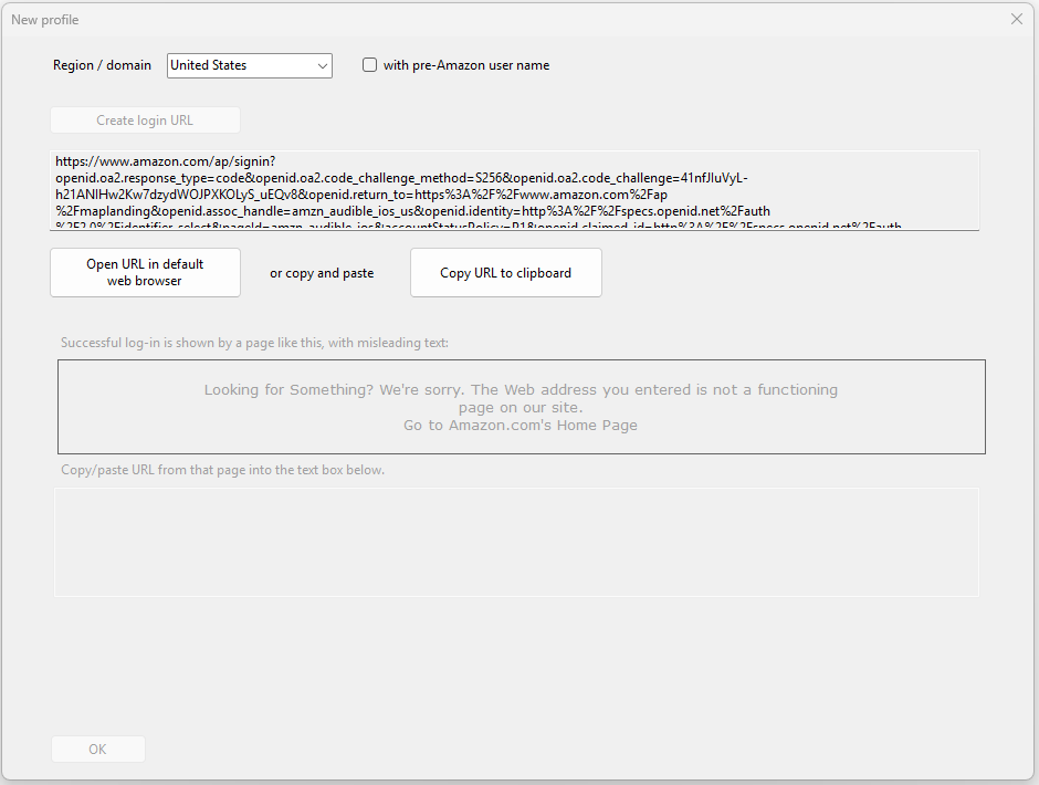 ii) In the “New profile” window, select the Region where your Audible account is located from the dropdown list, then click the button “Create login URL”.