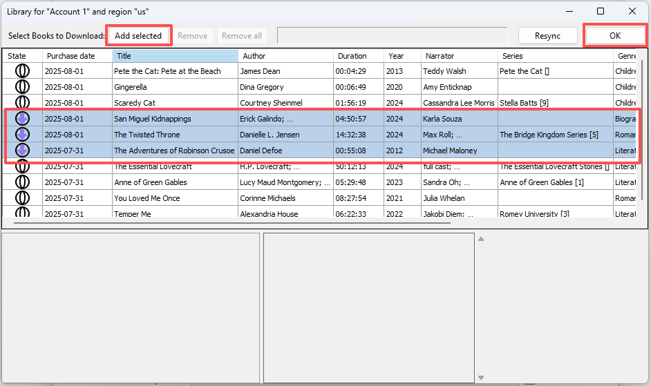 ii) In the Library window, select one or more books that you want to download, then click the “Add selected” button. Click the “OK” button to close the library window.